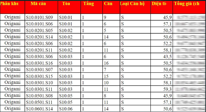 BẢNG GIÁ GỐC CĂN HỘ VINHOMES GRAND PARK – THE ORIGAMI