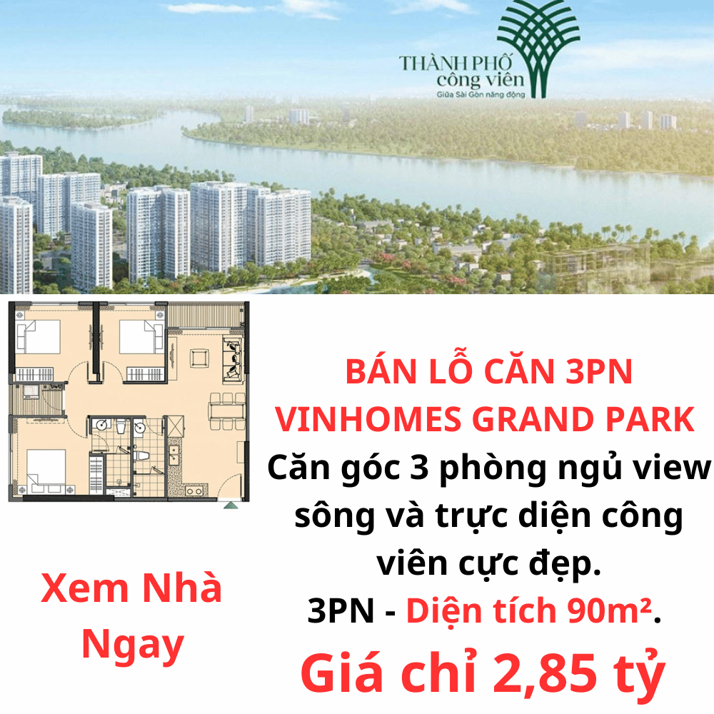 BÁN LỖ CĂN 3 PHÒNG NGỦ VINHOMES GRAND PARK 90M2 CHỈ 2,85 TỶ