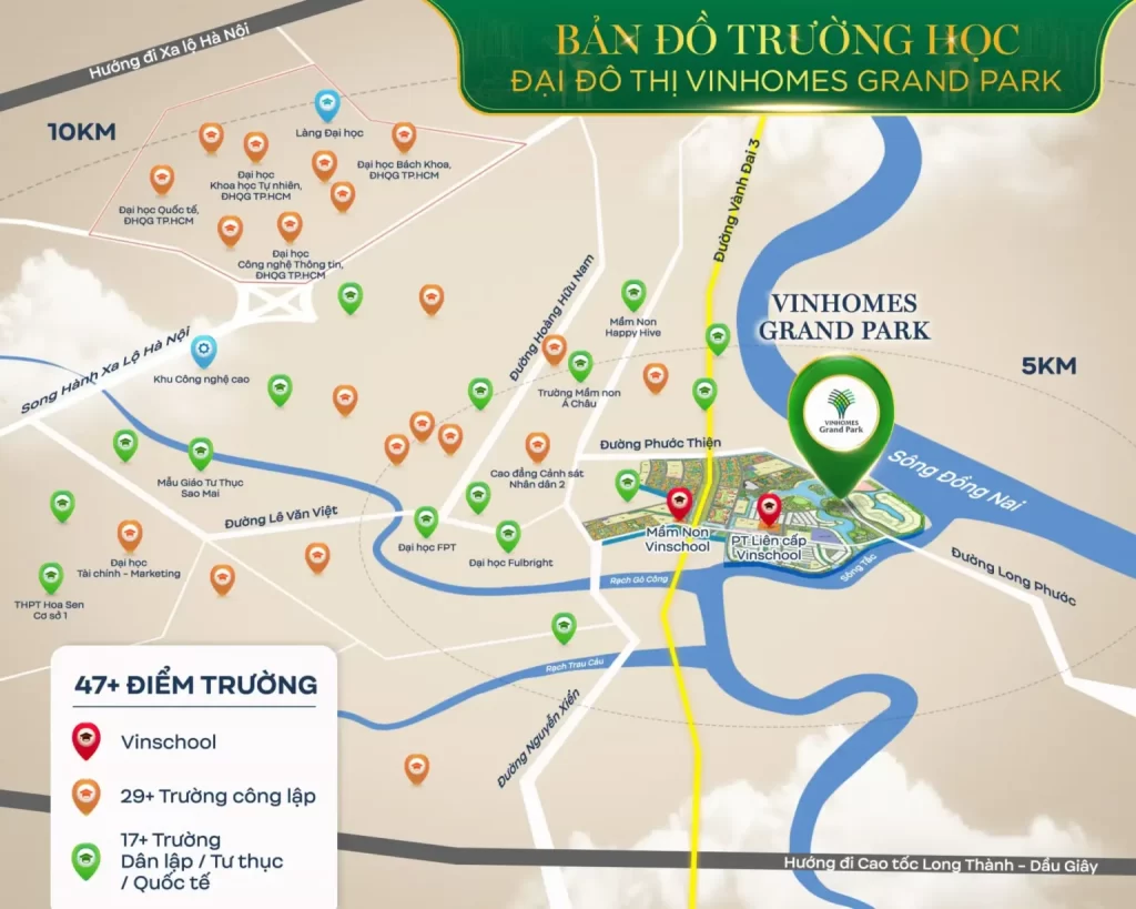 Cư dân tại Vinhomes Grand Park có thể nhanh chóng tiếp cận được với hơn 47 trưởng học, trong đó có 20 trường đại học lớn nhỏ trong bán kính chưa đến 10km, một số trường có thể kể đến như: Đại học FPT, Đại học Công nghệ TP. HCM (HUTECH), Đại học Fulbright Việt Nam, Đại học Tài chính – Marketing, Đại học Bách Khoa TPHCM, Đại học Kinh tế – Luật, Đại học Khoa học, Tự nhiên, Đại học Quốc Tế TPHCM, Đại học Khoa học Xã hội và Nhân văn, Đại học Công nghệ Thông tin, Đại học Quốc gia TPHCM.